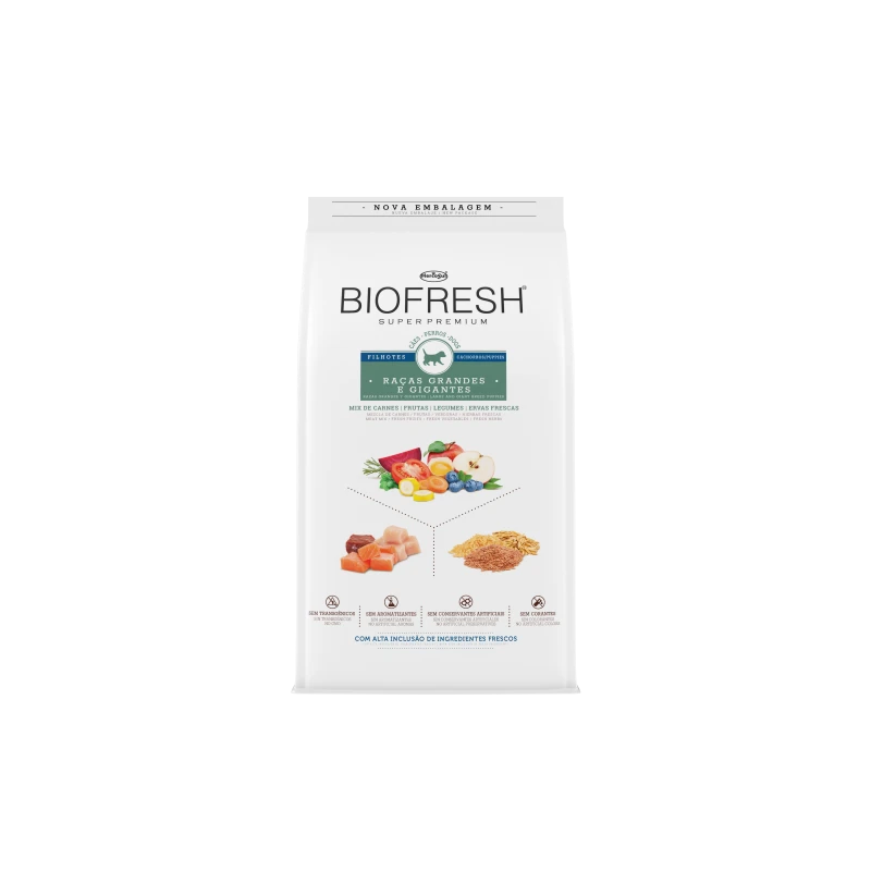 Biofresh Cachorros Razas grandes o gigantes es un alimento Super Premium completo y equilibrado que se destaca para elevar la nutrición de los cachorros de razas grandes y gigantes a su más alto nivel. Biofresh es innovador y diferente, porque esta formulado con una alta inclusión de ingredientes realmente frescos, directamente de la naturaleza. La tecnología Biofresh garantiza la conservación de este alimento de forma 100% natural y segura, sin conservantes artificiales añadidos.