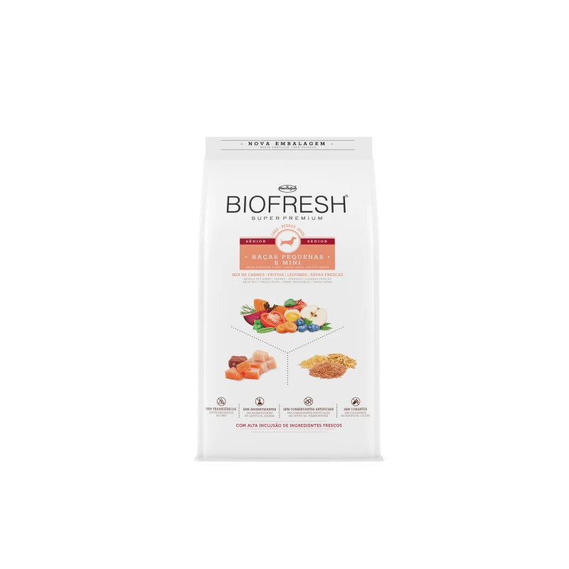 Biofresh Senior Razas pequeñas y mini es un alimento Super Premium completo y equilibrado que se destaca para elevar la nutrición de los perros mayores de razas pequeñas y mini a su más alto nivel. Biofresh Super Premium Senior ayuda a preservar características muy importantes de la juventud, tales como los músculos fuertes, la agilidad mental y la salud de los aparatos digestivo, renal y cardíaco. Biofresh es innovador y diferente, porque esta formulado con una alta inclusión de ingredientes realmente frescos, directamente de la naturaleza. La tecnología Biofresh garantiza la conservación de este alimento de forma 100% natural y segura, sin conservantes artificiales añadidos.