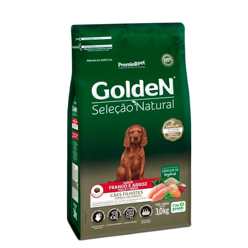 GoldeN Selección Natural Cachorros Talla Pequeña Pollo y Arroz es un alimento para perros cachorros de raza pequeña. La receta contiene un complejo de 6 vegetales, como fuente de fibras y sales minerales, bajo nivel de sodio para resaltar el sabor natural de los ingredientes, sin colorantes o saborizantes artificiales y sin ingredientes transgénicos. Con una selección de ingredientes especiales que ayudan en la reducción del olor de las heces. Con un equilibrio de omegas y minerales para una piel nutrida y un pelaje sedoso. Con ingredientes de alta digestibilidad y fibras naturales para un intestino saludable. Elaborado con DHA y proteína de alta calidad para un crecimiento saludable.